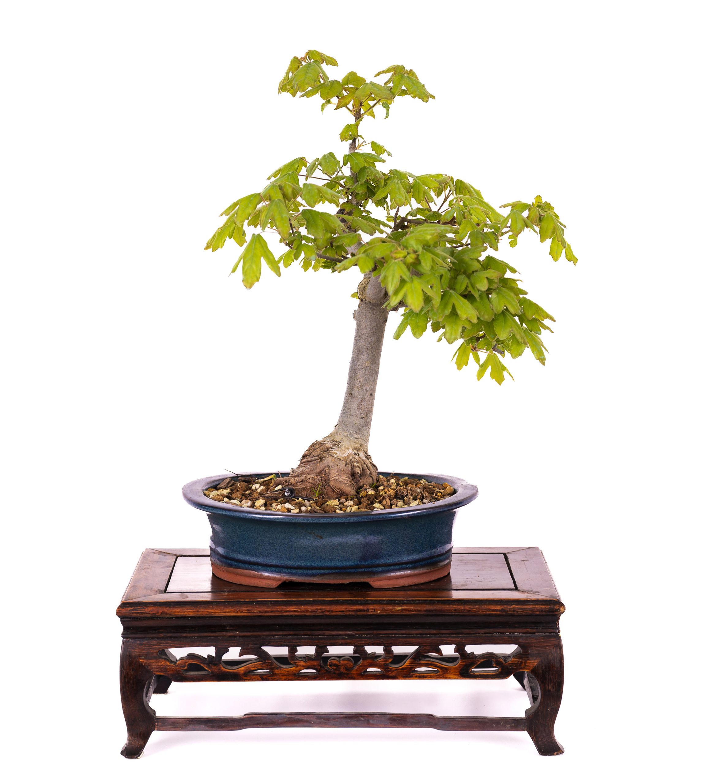 Especie caducifolia de hasta 10 m de altura que se encuentra en Europa y el norte de África. Su corteza gris-castaño se fisura con los años y sus hojas son palmatilobadas. Flores verde-amarillentas y fruto pequeño en doble samara. El estilo más común es el vertical informal (Moyogi).