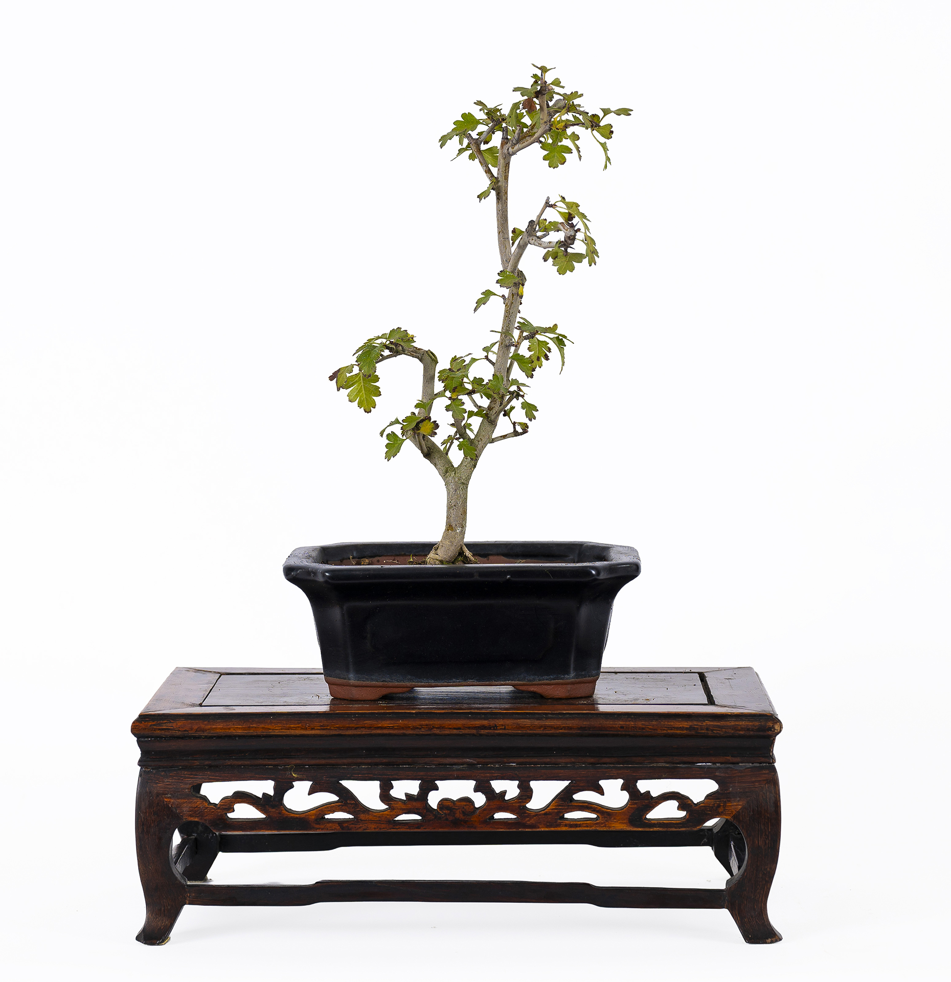 Deciduous tree 4-6 m high, with spiny branches, serrated leaves, odorous white flowers and reddish fruit. The most common styles are the curved informal upright (Moyogi), wind-swept (Fukinagashi) and semi-cascade (Han-Kengai).