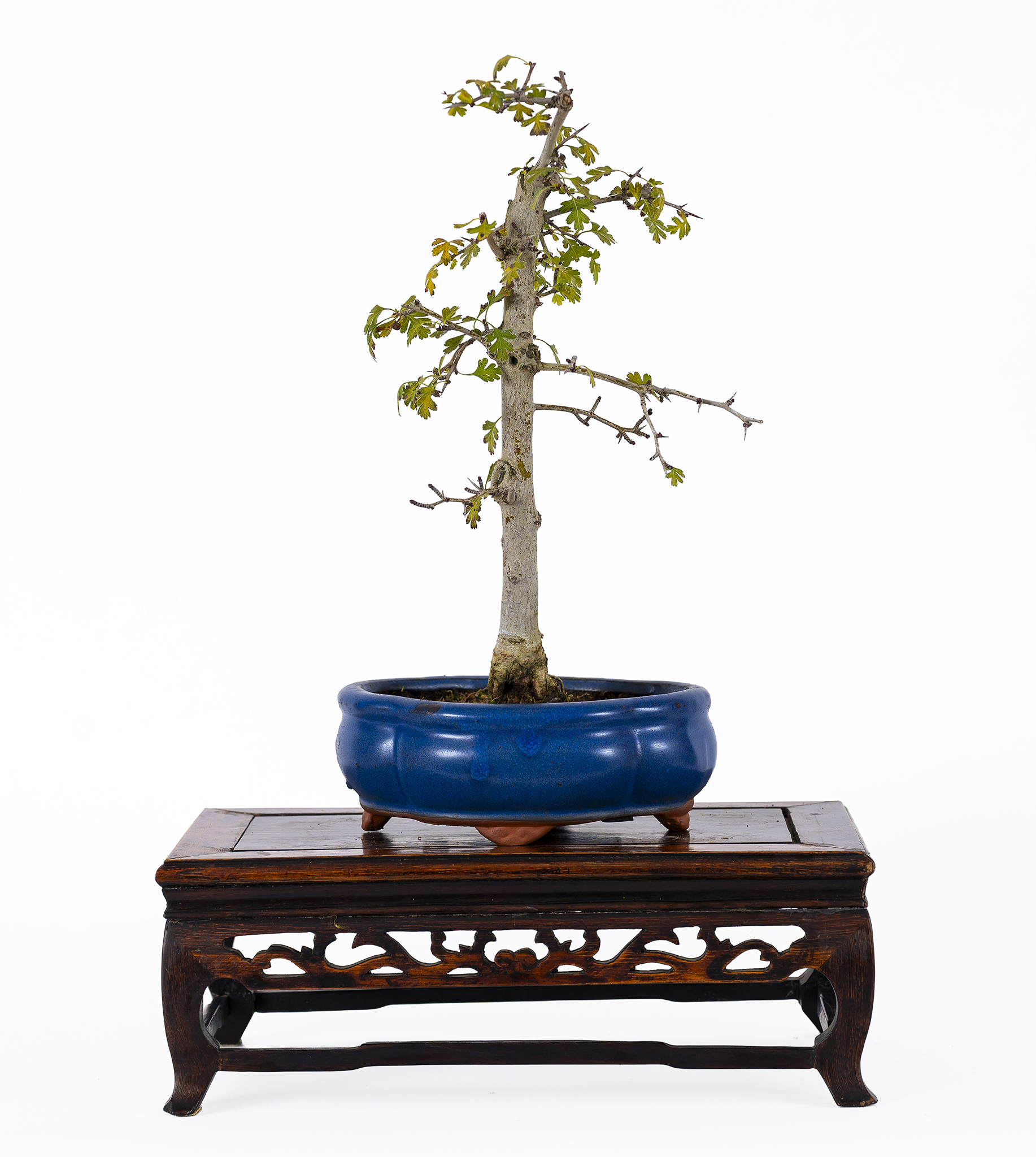 Deciduous tree 4-6 m high, with spiny branches, serrated leaves, odorous white flowers and reddish fruit. The most common styles are the curved informal upright (Moyogi), wind-swept (Fukinagashi) and semi-cascade (Han-Kengai).