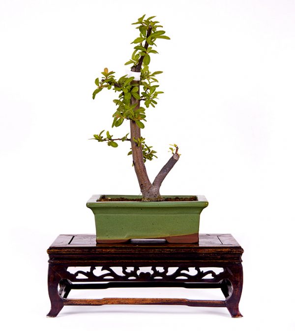 Arbuste de la famille des rosacées de caractère vivace ou semi-vivace et très résistante. Le tronc est brun grisâtre, avec des branches épineuses, des feuilles coriaces, dentées, lancéolates, alternant et brillantes sur le faisceau. Ses fleurs sont blanches, petites et très abondantes. Les fruits peuvent être rouges, oranges ou jaunes; restent sur les branches pendant l’hiver et nourrissent de nombreux oiseaux. Il s’adapte à de nombreux styles, le plus commun étant le droit informel (Moyogi), le battu par les vents (Fukinagashi) et semi-cascade (Han-Kengai).