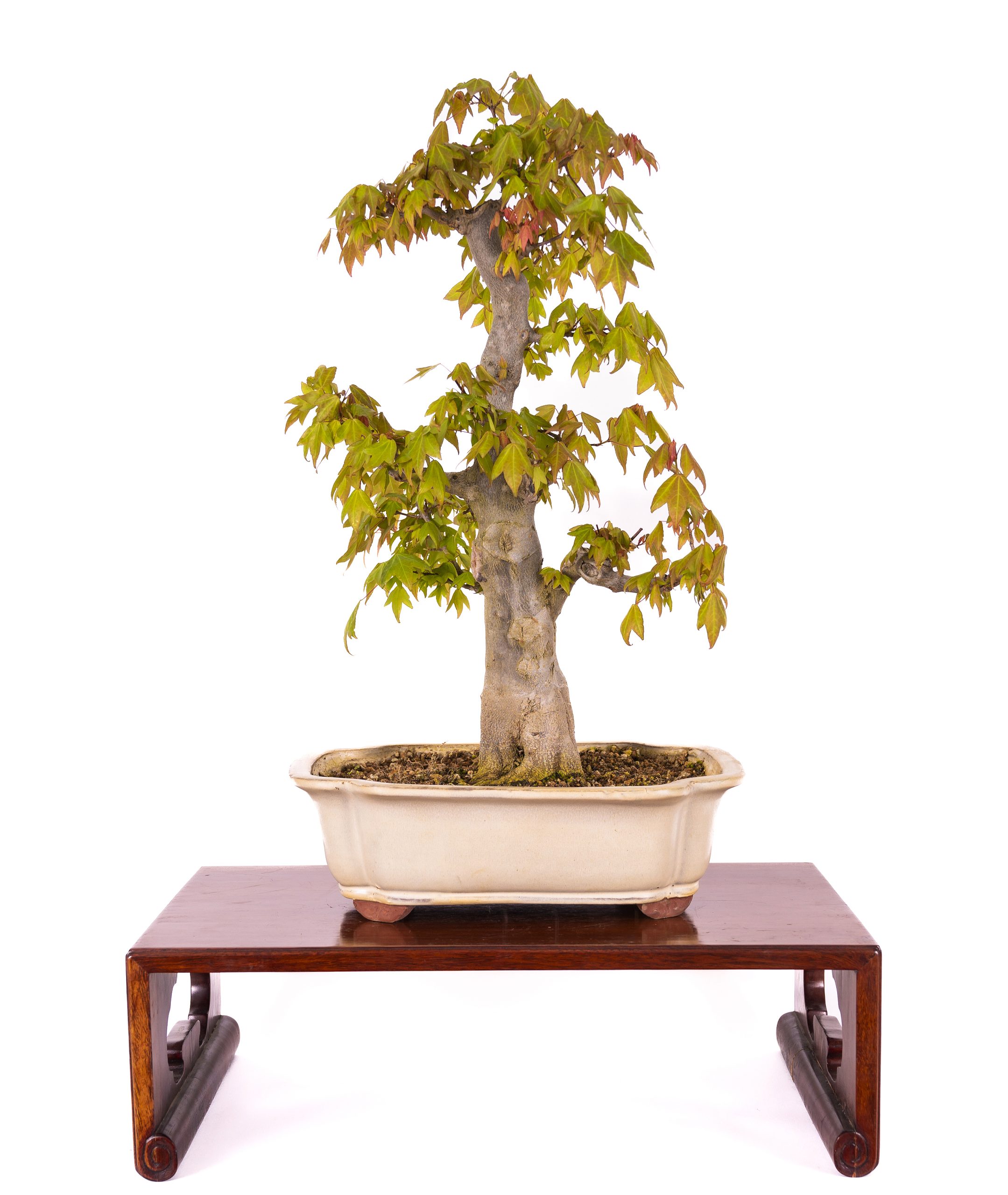 Árbol caducifolio de talla media, corteza grisacea y hojas trilobadas. Muy apreciado en bonsai por su robustez y belleza. Se adapta a cualquier estilo, aunque el más común es el vertical informal (Moyogi); también se emplea para plantaciones de grupo (Yose-Uye).