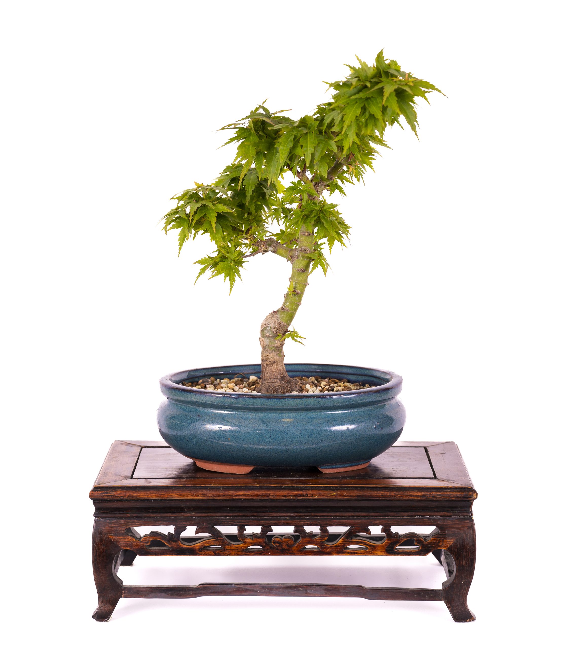 Arbusto caducifolio que alcanza alturas de 10 metros. Las hojas son pequeñas y profusas, palmeadas, con 5-7 lóbulos, delicadas y con colores rojos muy brillantes en otoño. Es el paradigma del bonsai caduco. Los estilos más comunes son el vertical informal (Moyogi), en grupo (Yose-Uye) y semi-cascada (Han-Kengai). Proteger del sol de mediodía en verano.