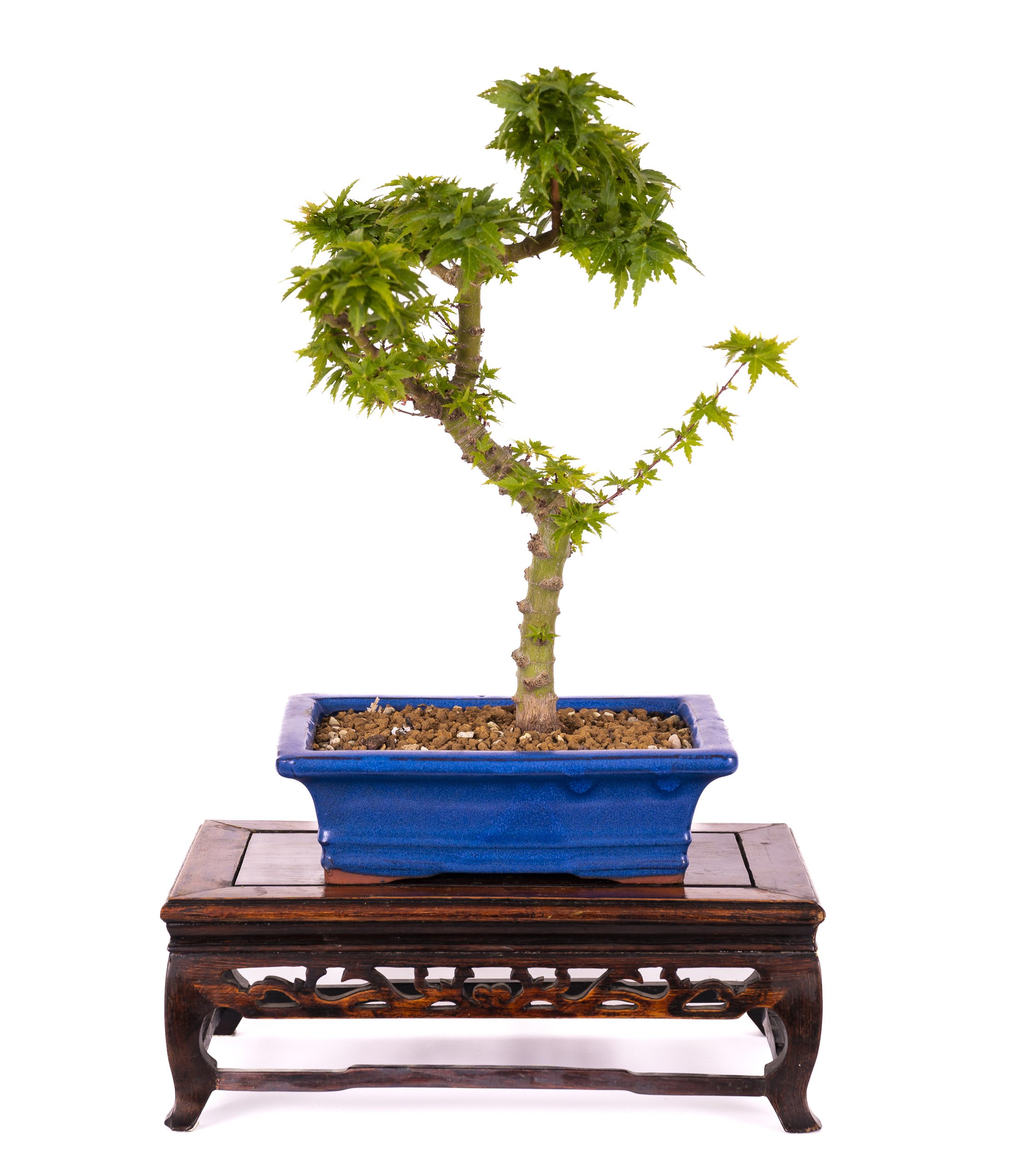 Arbusto caducifolio que alcanza alturas de 10 metros. Las hojas son pequeñas y profusas, palmeadas, con 5-7 lóbulos, delicadas y con colores rojos muy brillantes en otoño. Es el paradigma del bonsai caduco. Los estilos más comunes son el vertical informal (Moyogi), en grupo (Yose-Uye) y semi-cascada (Han-Kengai). Proteger del sol de mediodía en verano.