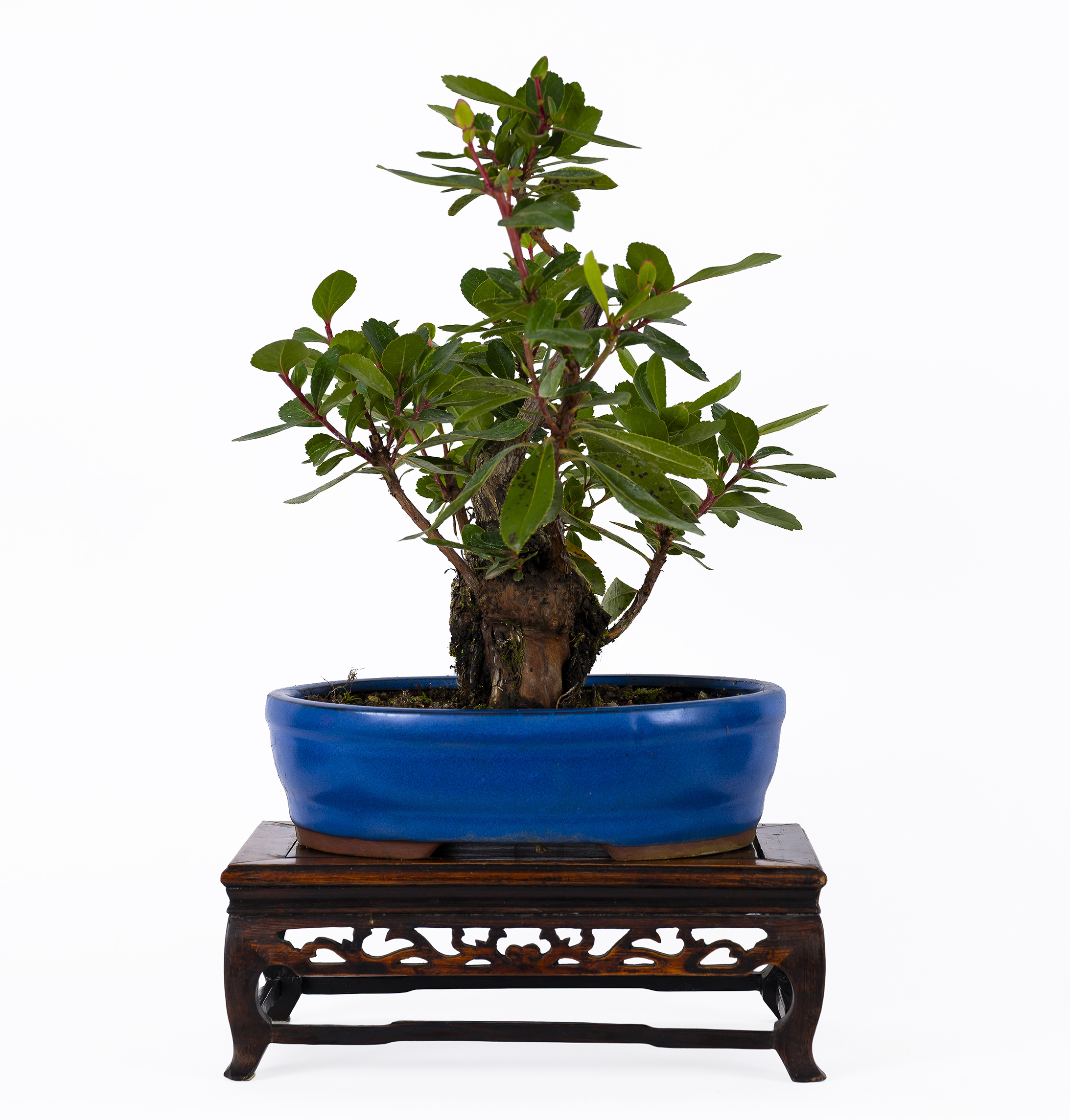 Arbusto mediterráneo de 4-10 m con troco rojizo, de corteza escamosa, y ramas grises. Las hojas son peremnes, lanceoladas, serradas, de color verde brillante. Las inflorescencias se presentan en panículas colgantes. El fruto es comestible, amarillo, anaranjado, y rojo en su madurez. Puede tener una base engrosada que brota bien, permitiendo su formación como shohin.