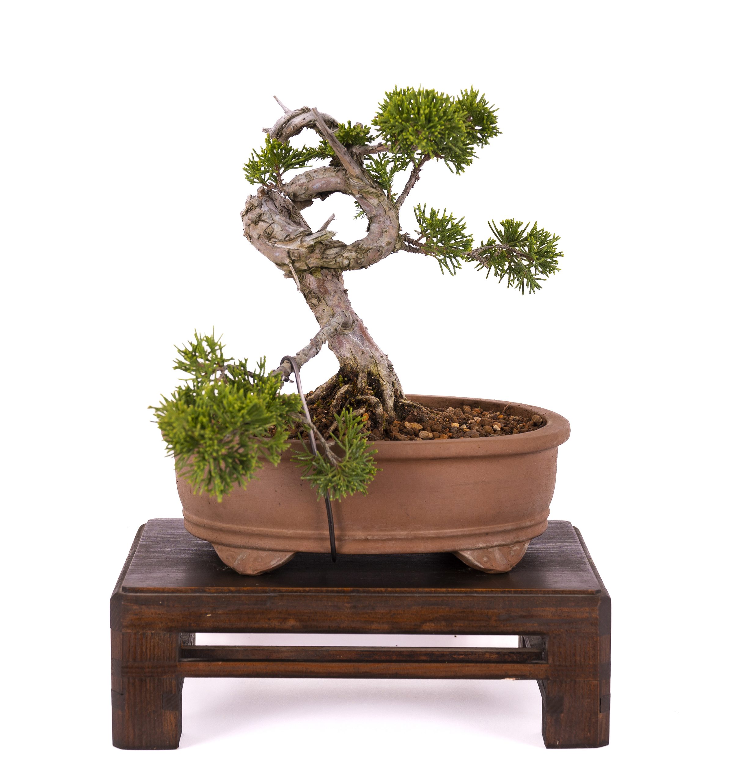 Arbusto perenne de la familia de los cipreses que crece naturalmente en zonas calizas. Su encanto radica en la combinación de la madera muerta con venas vivas retorcidas, dando la impresión de un árbol que ha sobrevivido a numerosas catástrofes naturales. Los estilos más comunes son el vertical informal (Moyogi), enraizado en roca (Ishizuke), azotado por el viento (Fukinagashi) y semi-cascada (Han-Kengai).