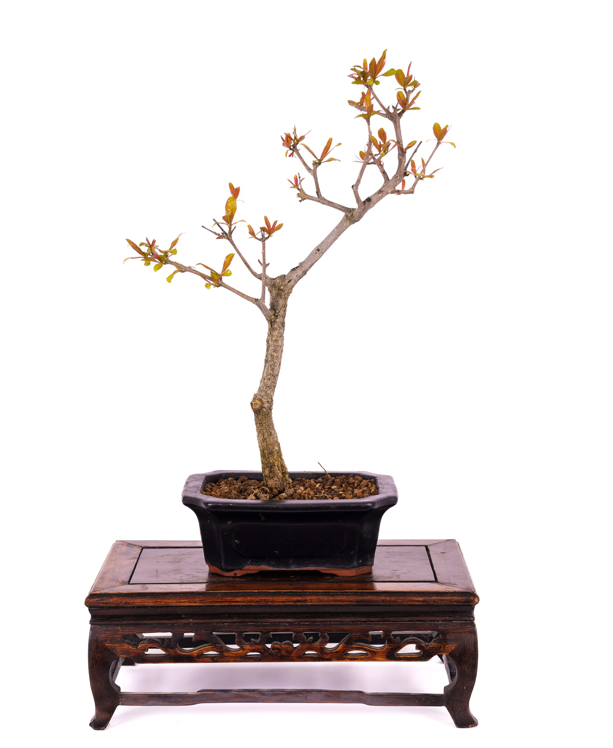 El tronco crece naturalmente de forma retorcida (Nejican) y en sus ramas jóvenes crecen espinas. Sus flores rojas de primavera dan frutos que se abren en otoño para enseñar sus granos rojos. Los estilos más comunes son el vertical informal (Moyogi), multitronco (Kabudachi), y el inclinado (Shakan)