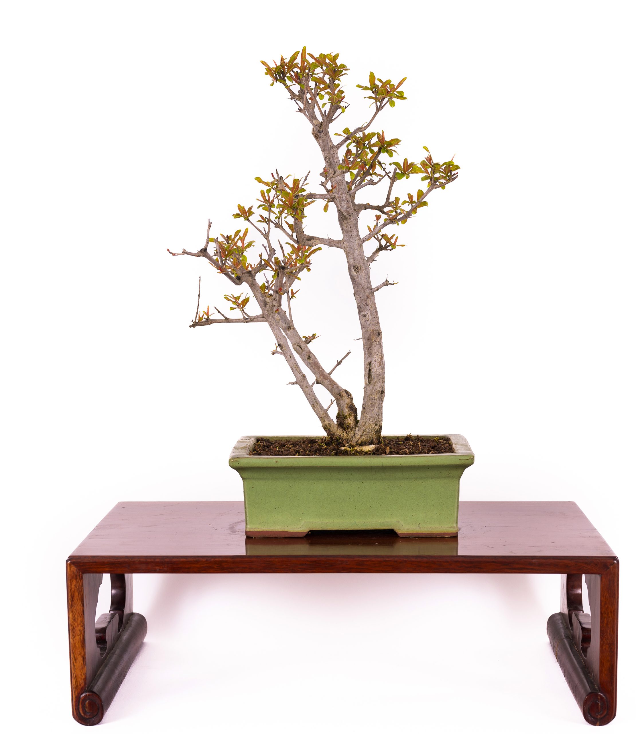 El tronco crece naturalmente de forma retorcida (Nejican) y en sus ramas jóvenes crecen espinas. Sus flores rojas de primavera dan frutos que se abren en otoño para enseñar sus granos rojos. Los estilos más comunes son el vertical informal (Moyogi), multitronco (Kabudachi), y el inclinado (Shakan)